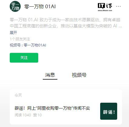 关于“阿里收购零一万物”的网络谣言是不真实的。