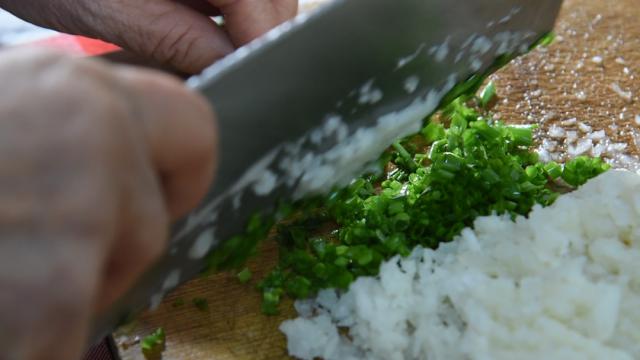 1. 将萝卜去皮,剁成泥,切成葱;