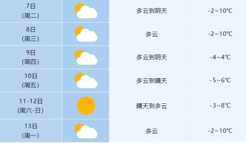 7日(周二):淮北地区阴天;淮河以南多云至阴天。