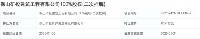 乐居财经 张林霞 1 月 7 日,保山矿投资矿产资源开发有限公司挂牌转让保山矿投资建设有限公司 100% 股份 ( 二次挂牌 ) ,出让底价 1051 一万元,披露时间为 2025 年 01 月 08 日至 2025 年 01 月 21 日。