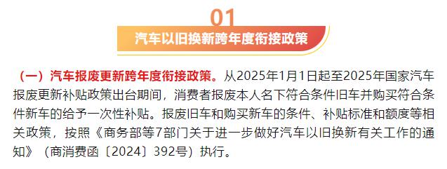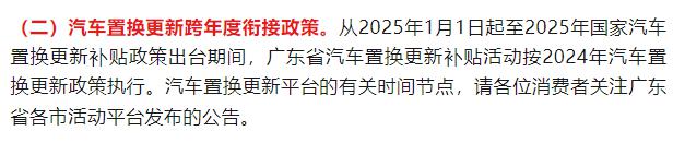 1 月 3 日,广东省商务厅发布了关于跨年连接的公告。 2025 2008年商业领域消费品新旧置换通知,汽车报废更新补贴和更换更新补贴将持续,详见下图: