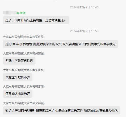 我们的车帮买就有这样一个“回头客”,C 先生在 12 月初找到我们想买一辆宝马。 i3,贷款已经通过。但是当时网上已经开始出现了。 2024 年度补贴政策结束的消息,所以我们的客服也立即通知了车主,所以经过反复考虑,我们决定暂停买车计划,我们也全力配合客户办理退订手续。