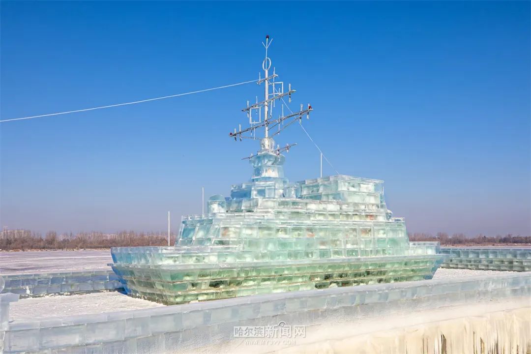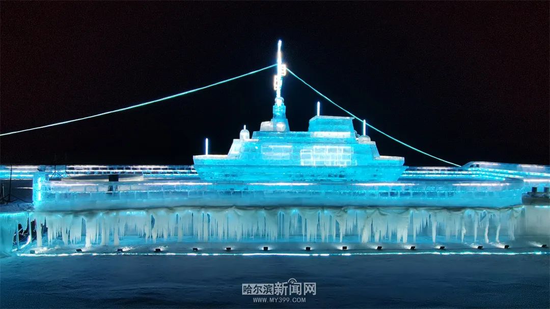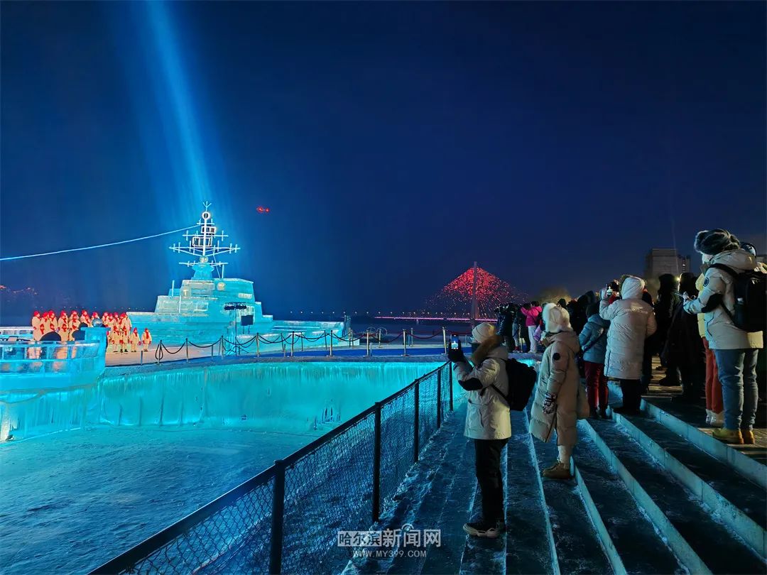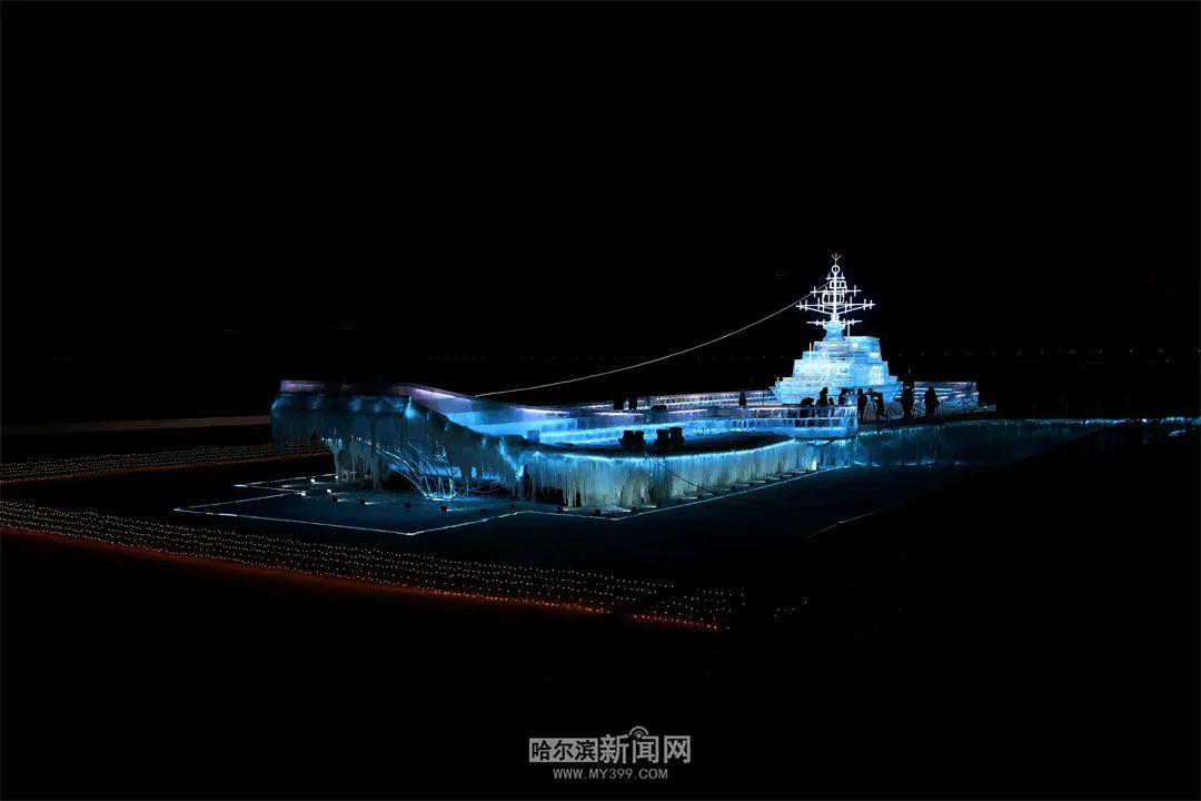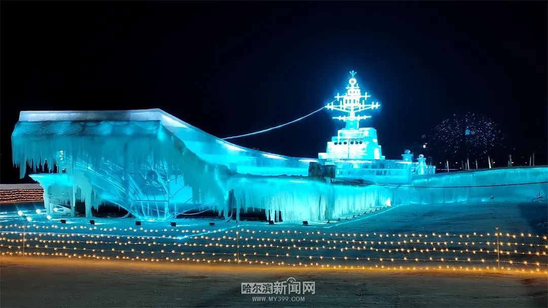 “冰雪辽宁舰”璀璨明亮,来哈游客争相打卡赞叹“特别震撼”