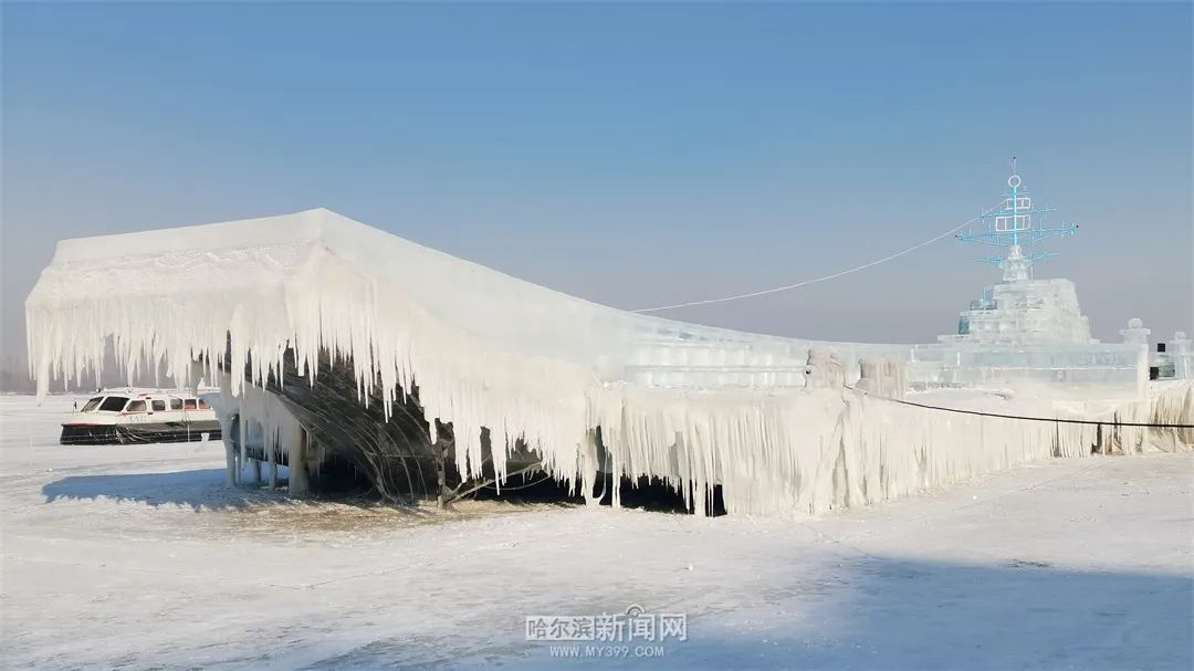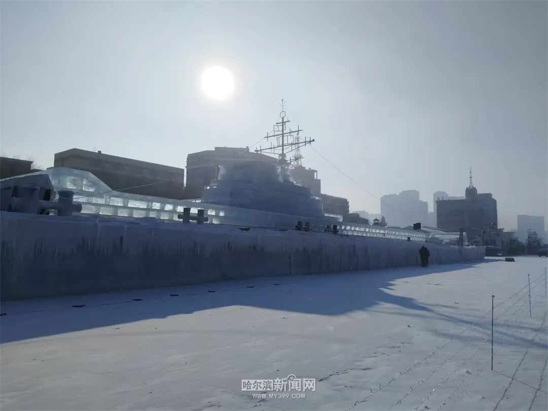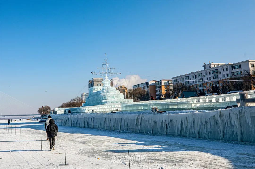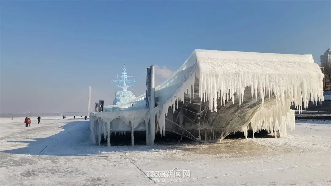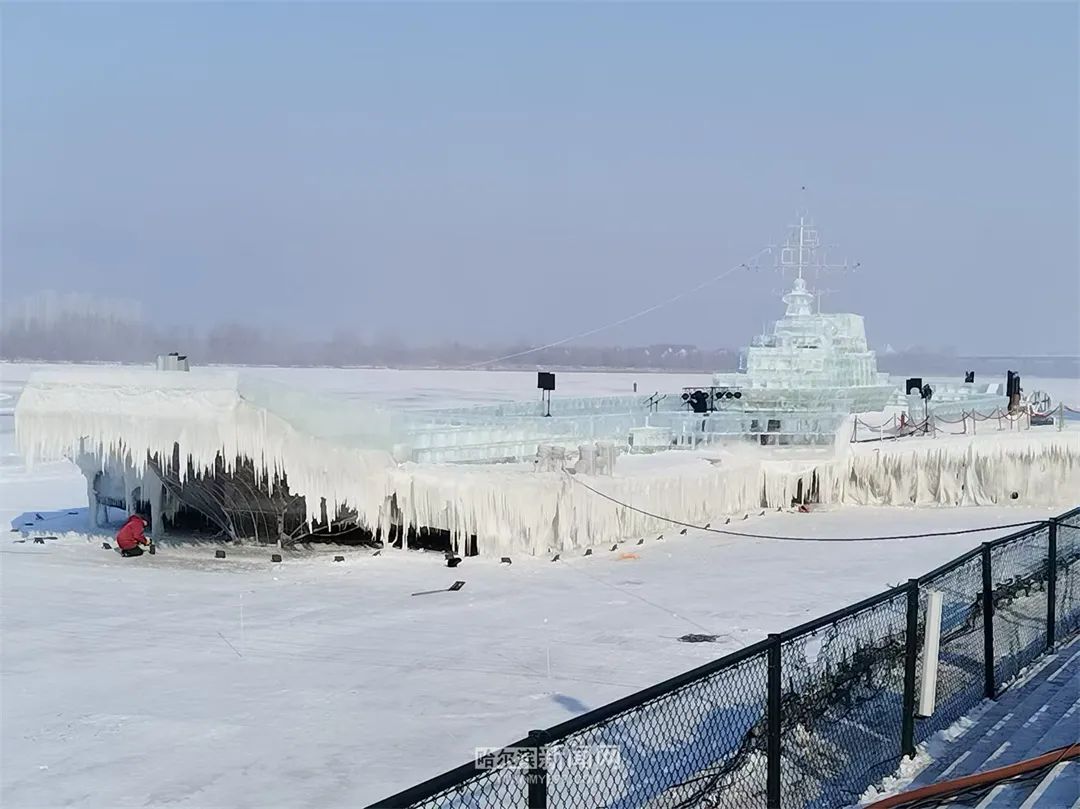 “冰雪辽宁舰”璀璨明亮,来哈游客争相打卡赞叹“特别震撼”