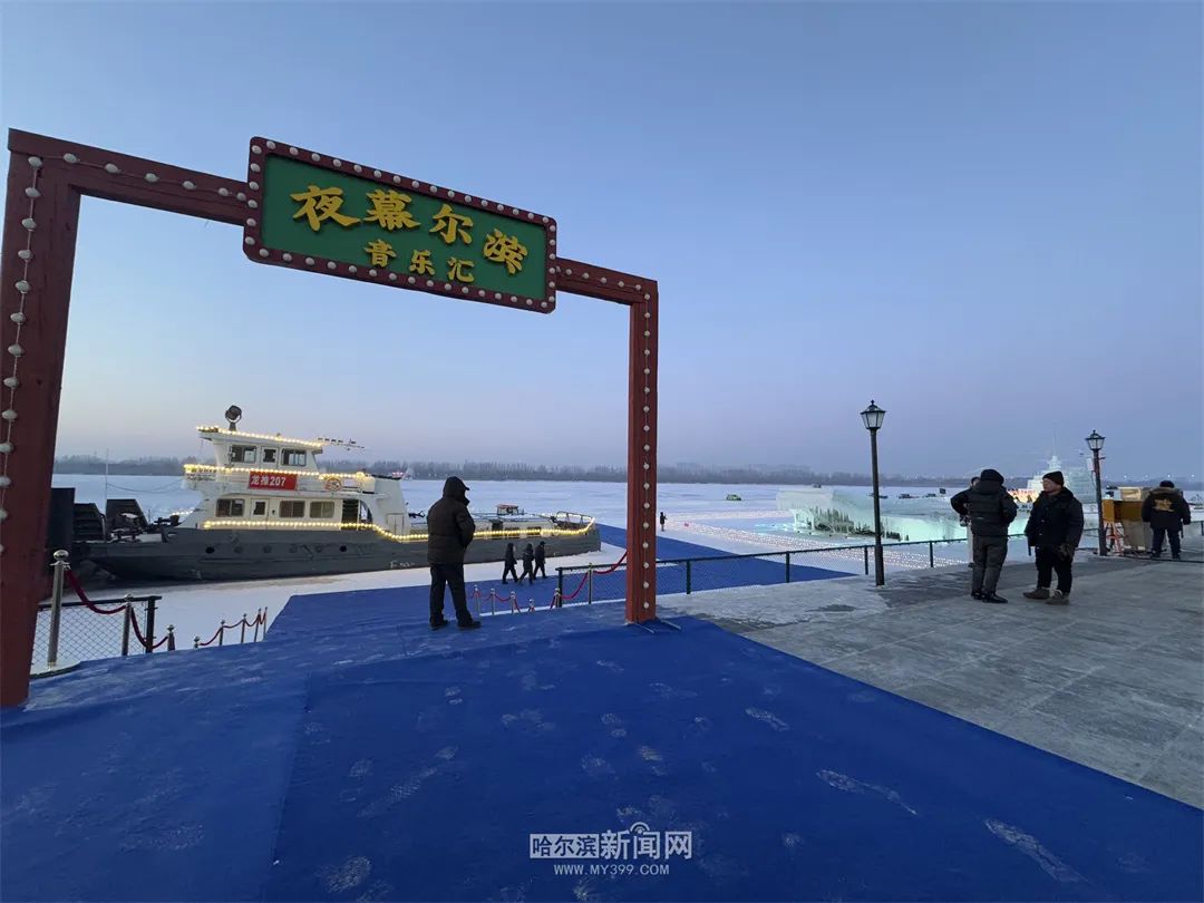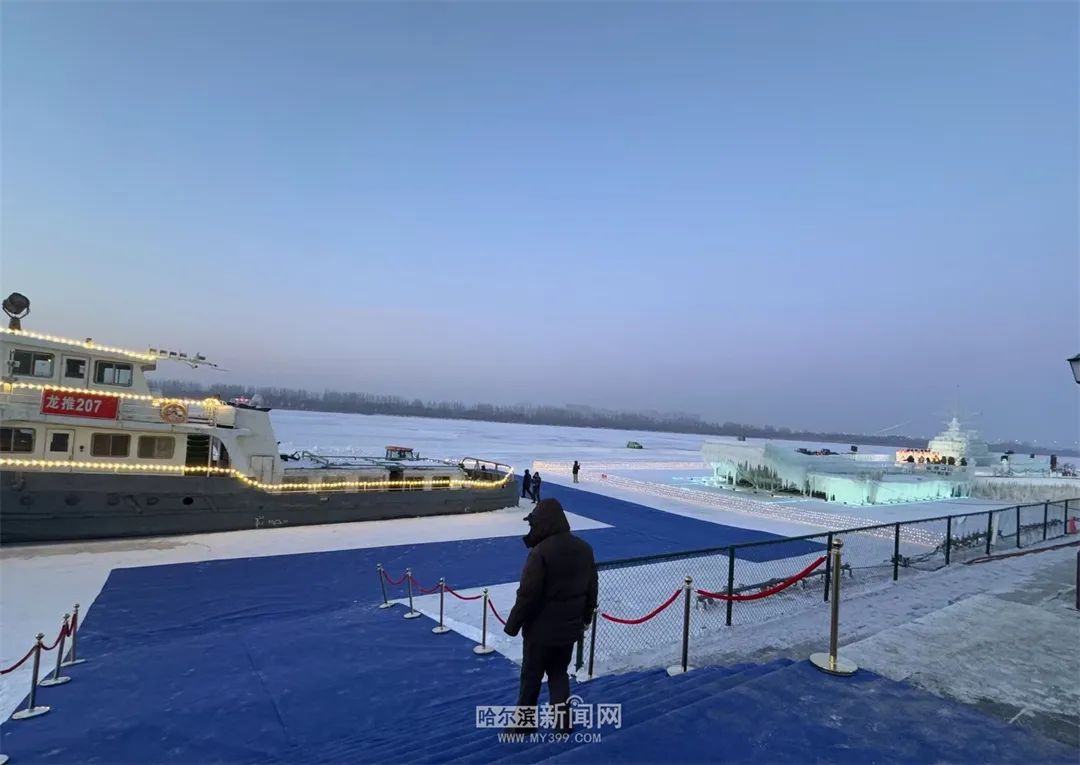 记者看到,在江面上,“冰雪辽宁舰”前面还铺上了蓝色地毯,方便市民和游客在此区域拍照。