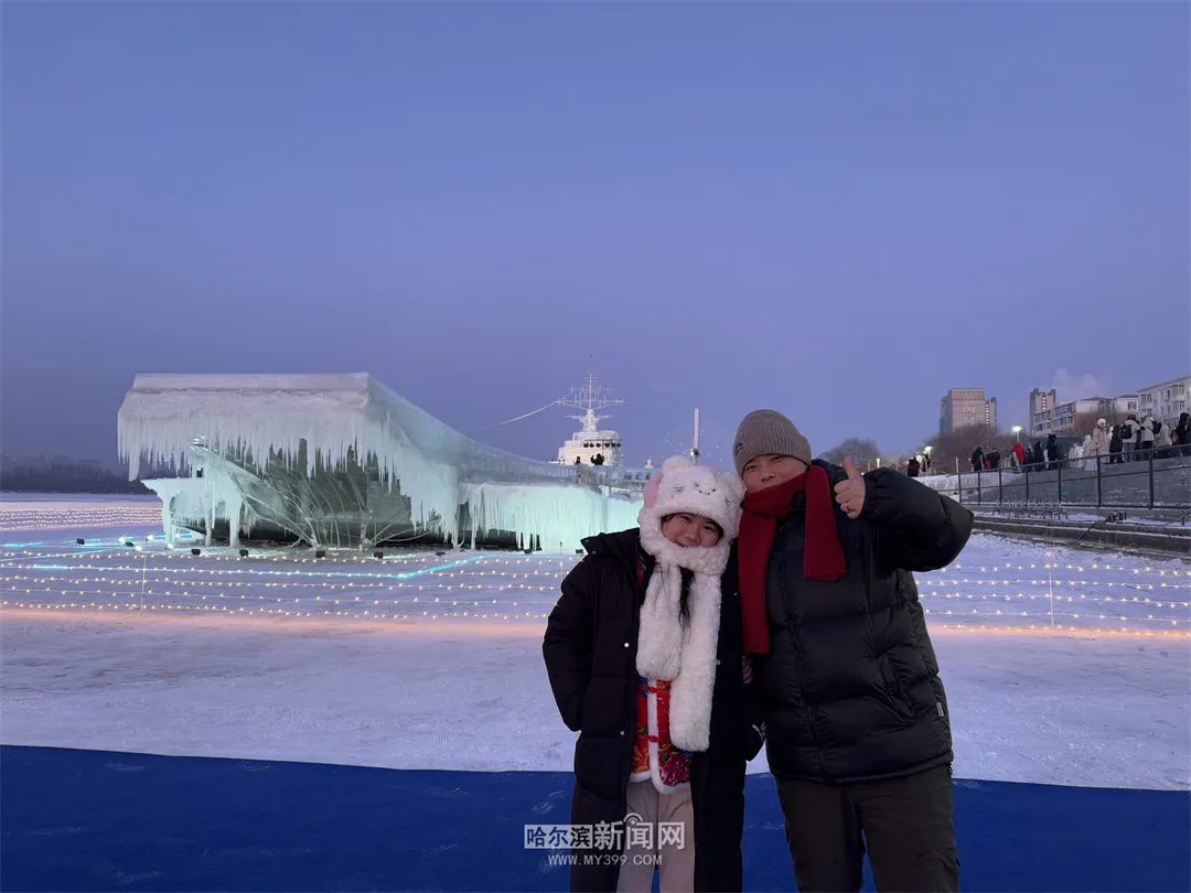 “没想到,我们赶上了‘冰雪辽宁舰’的亮灯时刻,在现场观看,特别震撼。”1月6日晚,来自秦皇岛的游客刘先生和家人来到道外河畔,专程“打卡”冰雪辽宁舰。谈到这次哈赏冰雪之旅,他说:“我感觉很好。虽然哈尔滨的温度很冷,但我充满了热情。”