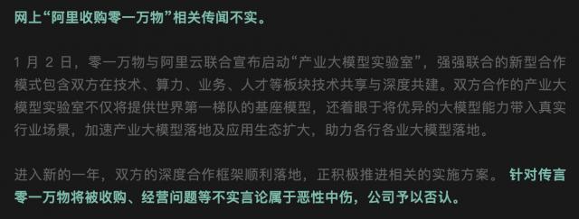 2025 年 1 月 6 一个关于“日,一个关于” 01 万物散伙了 社交媒体上开始出现卡片和预训练团队卖给阿里的传言。随后,零一万物创始人兼创始人 CEO 对此,李开复作出了辟谣: