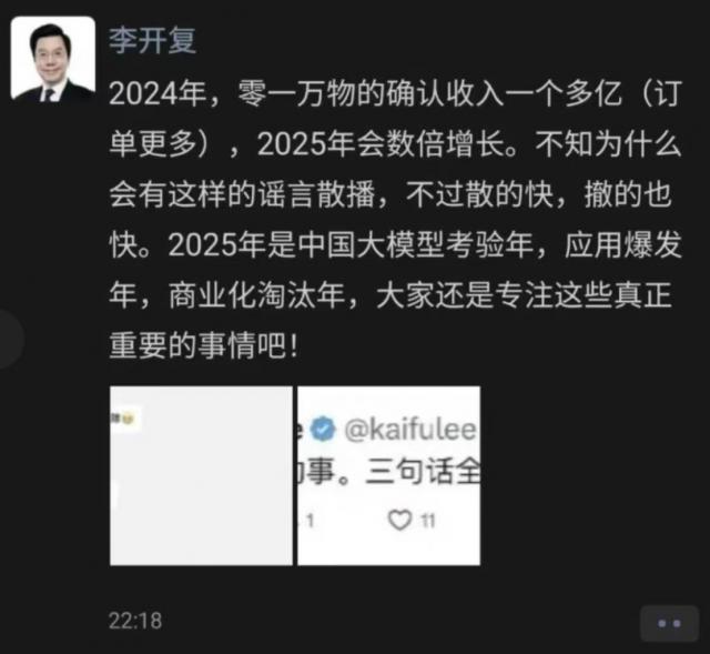 自救,或者给零一万物生存的钱。正如李开复在辟谣中所说:“ 2024 年,零一万物的确认收入超过一亿。 ( 订单更多 ) ,2025 年度会议数倍增长。”