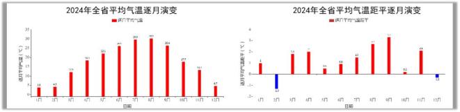 春秋两季,全省平均气温各高1.4℃和1.9℃,均为同期最高。夏季高度为1.7℃,是历史同期第二高,仅低于2022年。全年气温偏高10个月,其中9月份是历史上最高的。除2月和12月平均气温偏低外,其余10个月均较高,其中9月异常高3.3℃,是同期历史最高;8月和4月是同期历史第二高,11月和3月是同期历史第四高。