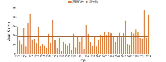 2024年,全省平均高温日数为42.7天,历史第三,仅低于2022年(47.5天)和1967年(43.6天)。