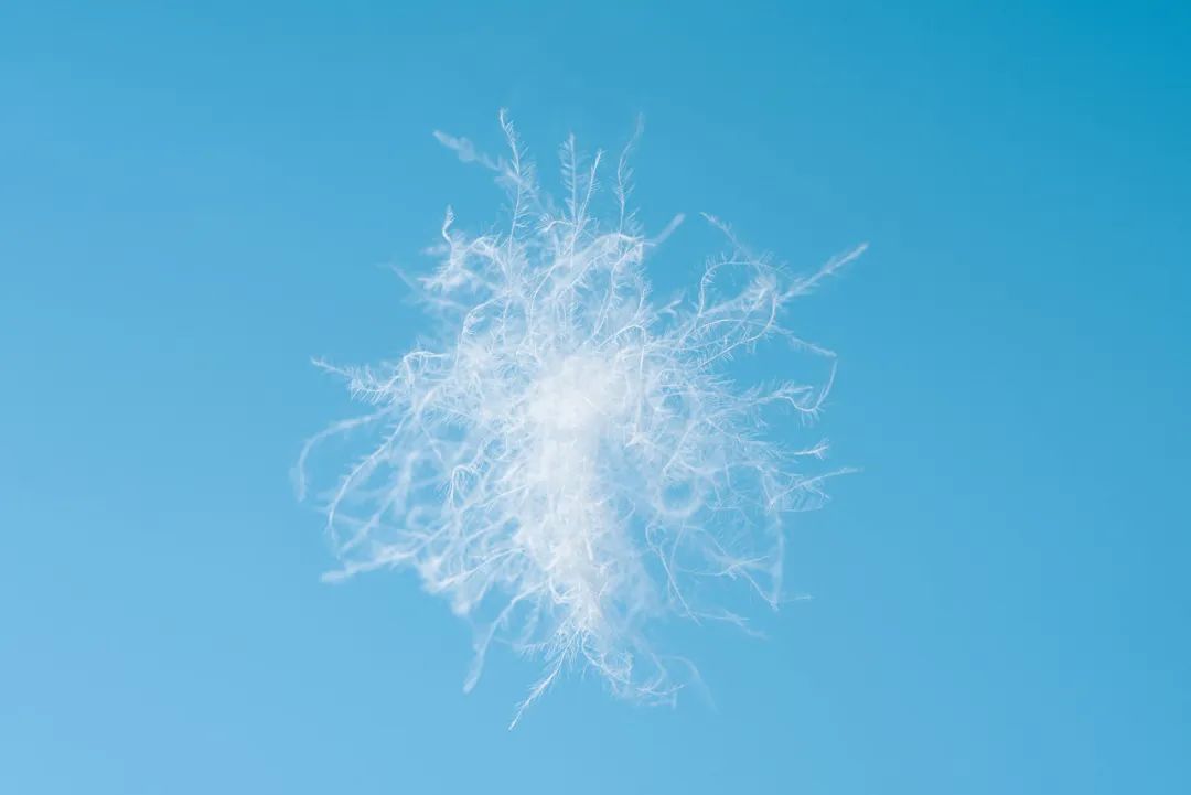 绒毛是一种三维结构,由绒毛核向四周发射多个丝状物体形成。从外观上看,它就像一朵大蒲公英,呈现出三维球形结构。