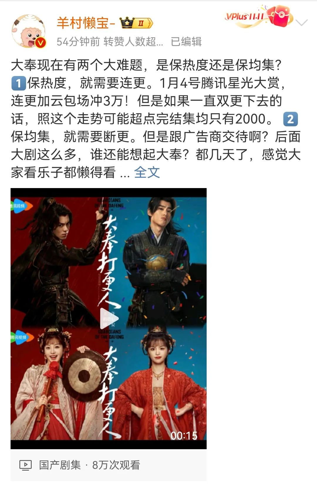 然而,《大奉打更人》受到观众市场的攻击,不仅仅是因为剧集的质量口碑,还因为剧集的质量口碑,激发了部分观众的叛逆,来自于其定档前期的“锣鼓喧天”造势。