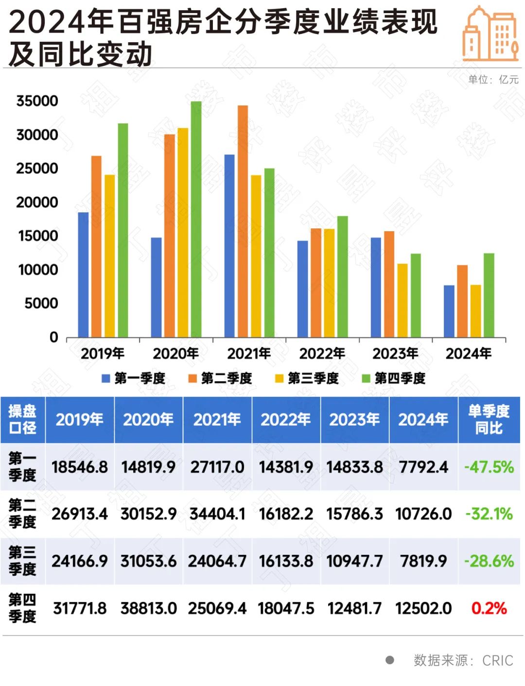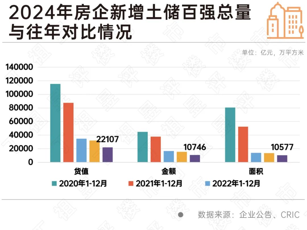 但需要注意的是,房地产企业投资连续三年下滑。2024年,新增土储百强房地产企业新增货值、总价和建筑百强总价分别为22107亿元、10746亿元和10577万平方米,同比下降分别为31%。、与去年年底相比,31%和21%的减幅持续增长。尤其是与2020年高峰相比,投资金额已经下降了76%。