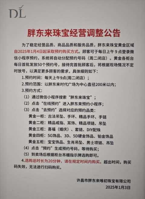 一月三日,胖东来珠宝有限公司发布调整公告,自2025年1月4日起,胖东来珠宝黄金区采用预约购买渠道。