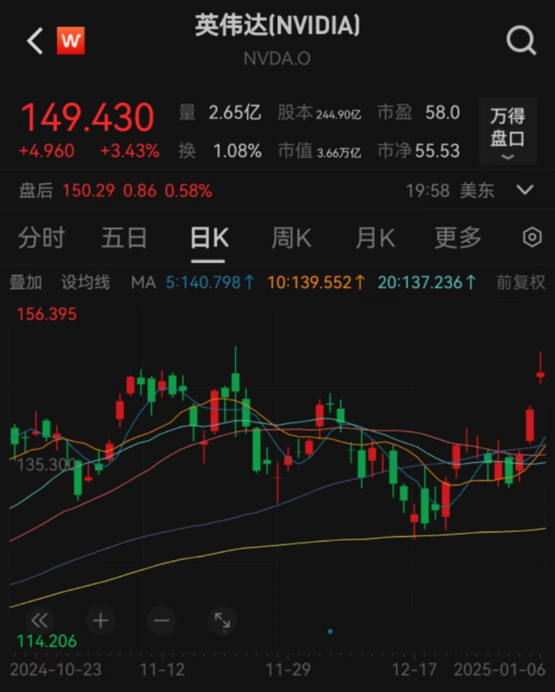 根据Wind数据,当地时间1月6日,英伟达上涨3.43%,最新股价为149.43美元,最新总市值为36595.41亿美元;最近三个交易日累计上涨11.27%。