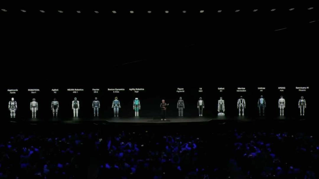 他还公布了英伟达在人形机器人领域的合作伙伴名单,其中国内厂商包括宇树科技人形机器人H1和小鹏汽车人形机器人老铁。