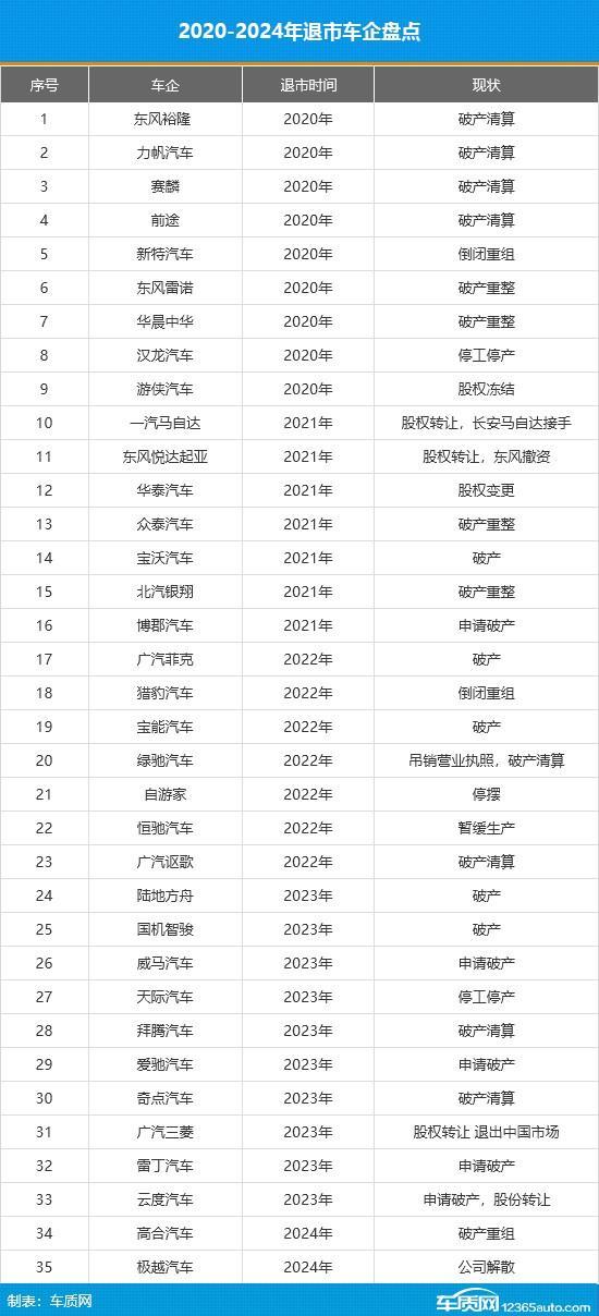 据《华尔街日报》统计,2018年,中国电瓶车制造商超过487家,但到2023年,小鹏汽车CEO何小鹏指出,只有大约50家新势力汽车公司仍在正常运行。根据汽车质量网络的不完全统计,在过去的五年里,有超过40个汽车品牌正式退出中国市场,破产重组,停止经营汽车业务。