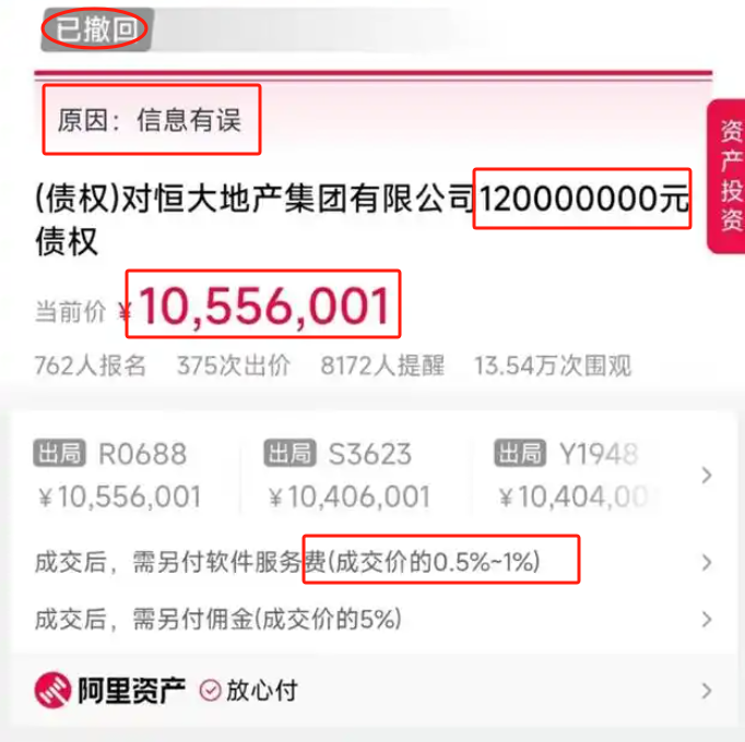 对于恒大地产集团有限公司的1.2亿元债务,在被撤销之前, 已有762人报名,375次出价,13.54万次观看。