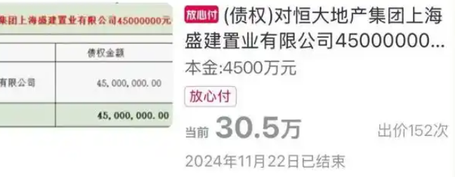 从过去的拍卖信息来看,恒大的债权出价往往可以达到几十万。在拍卖网站上,恒大的最终拍卖价格达到了4500万元。 30.5万元。