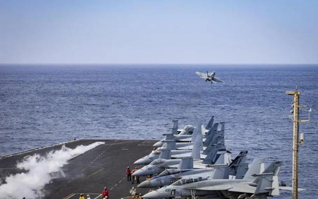 [一架舰载机刚刚从美国航空母舰上起飞]