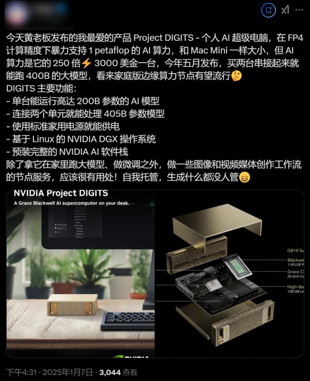 最后,我们还是来看看老黄手里拿着的这个。 " AI 掌中宝 " 是的,它的官方名称是 Project DIGITS ,您可以把它看作是一种可用于跑步的方法。 AI 的 Mac mini 。