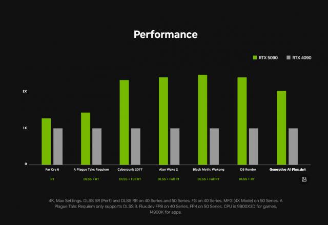 但是...事实上,老黄所说的并非人人都知道的光栅化性能,而是 DLSS 4 加持后的游戏性能。 5090 之所以跟 4090 将会拉开如此大的性能差距,也是因为在打开光线跟踪的情况下进行比较。。