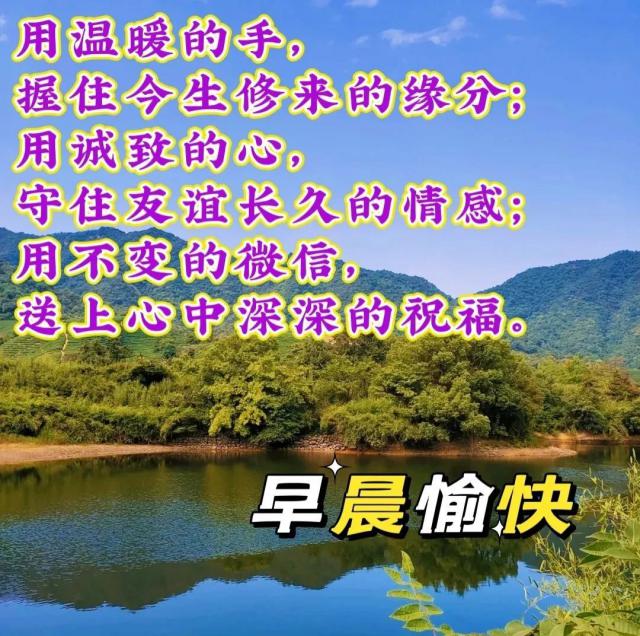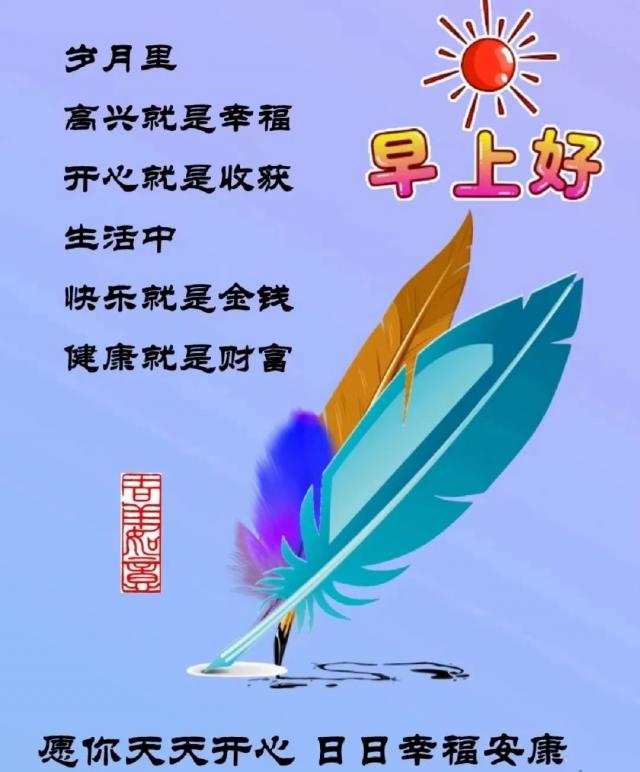 一天快乐,没有烦恼。每天快乐,长生不老。心满意足,岁月特好。身心健康,稀世珍宝!早上暖心的问候,互相关心。命运让我们永远不会忘记对方,祝我们幸福健康。早上好。
