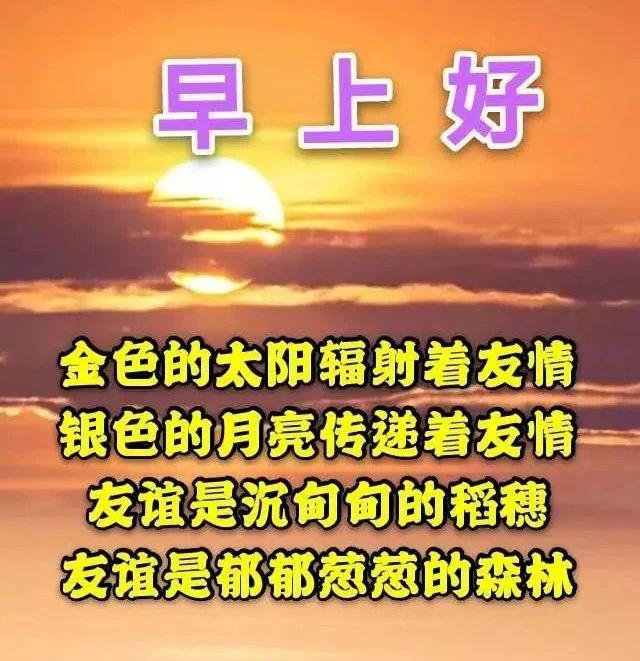 早上好,天空的美是彩虹;世界的美是真诚;心中的美是朋友;人生的美是情感。愿我们每天都有好心情!真情是一条河,永远流淌;缘分是一座桥,永远相连;友谊是一棵松树,永远是绿色的!晨安吉祥!