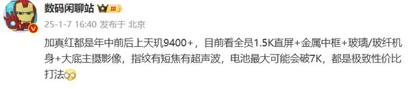 1 月 7 日,博主 @数码闲聊站 据透露,一加、真我、红米计划在年中前后推出搭载天玑的天玑。 9400 新型号。这些手机将配备 1.5K 直屏、金属框架、玻璃或玻璃纤维机身,主要推动鞋底主摄像头,指纹验证方案包括短焦和超声。电池电量有望突破 7000mAh,整体配备极具性价比。