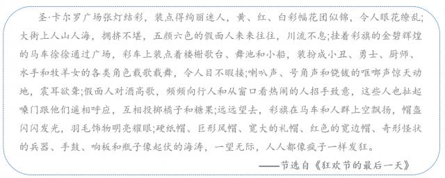 当你遇到这个精彩的片段时,你应该默读和注释,你应该一遍又一遍地欣赏你的感受。这一幕的描述,运用了点面结合的写法,让人感觉仿佛身临其境,体验到了热闹的气氛。这么精彩的片段书还有很多。你可以找到其他精美的段落,在小组中大声朗读,与学生分享你的感受。(板书:欣赏语言)