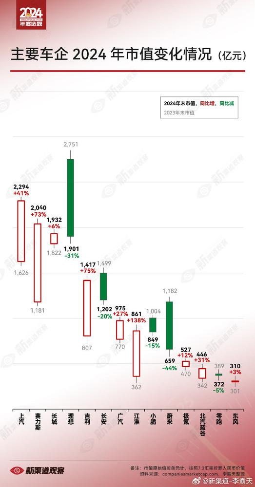 【CNMO 近日,科技新闻:CNMO 注意到,一位汽车博主总结了一下。 2024 年末,中国主要汽车公司市值的变化趋势指出,今年市值变化的主要特征是:新力量汽车公司市值回调,传统汽车公司市值增长。