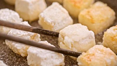 将淀粉均匀地包裹在豆腐表面,