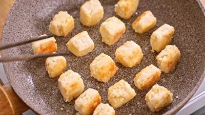 将豆腐块放入小火中慢煎,