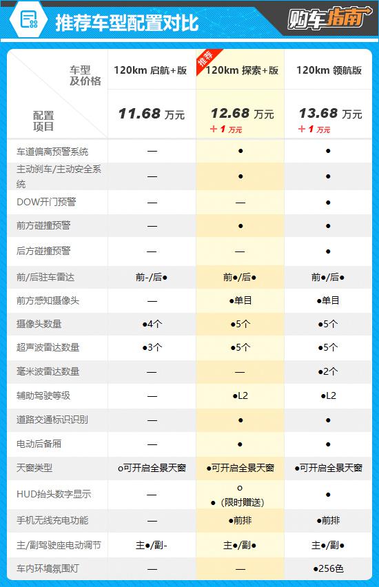 推荐车型为 120km 探索 版,售价 12.68 万元。作为次顶车型,相对较低的一款车型主要增强了部分车型。 / 车道偏离预警系统、主动刹车等被动安全和实用设备。 / 主动安全系统,L2 等级辅助驾驶和电动后备箱等。结合 1 从1万元的差价来看,性价比极高。值得注意的是,推荐车型也可以享受官方限时赠送。 HUD 抬头数字显示,这样的“羊毛”怎能不薅!