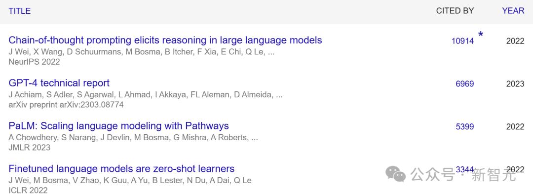 自2020年以来,谷歌的学术引用已经达到48338,其中最著名的论文是2022年发表的。「Chain-of-thought prompting elicits reasoning in large language models」,目前,单篇论文的引用量已达10914。