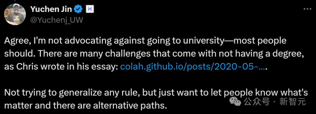 网民Yuchen也同意niv的观点,他认为「大部分人还是要上大学的,因为没有学位的人确实面临着很多挑战。关键是人们应该知道自己想要什么,有很多方法可以实现自己的目标。」。