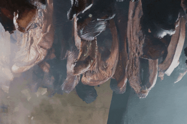 把腊肉挂在棚子里的柴火堆上面熏烤