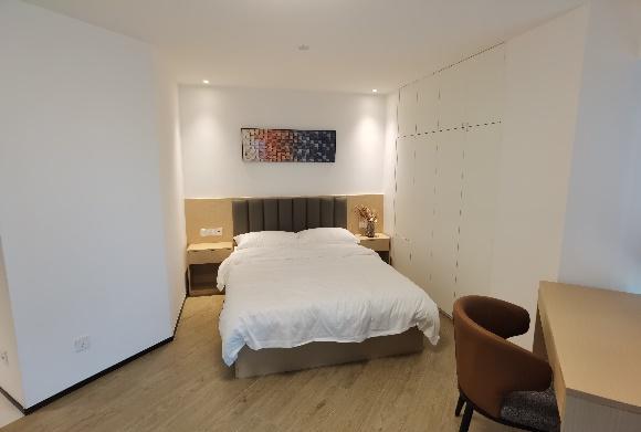 "公寓分为 5 种类型的公寓,面积在 32-45 平方米不一样。定制家具和一线品牌电器都是精装的,可以满足个人或家庭的需求。“据卢嘉豪介绍,目前公寓的外部装修已经接近尾声,橱柜家具已经基本安装完毕。