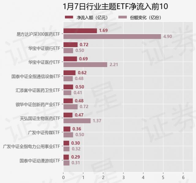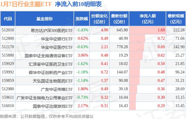 证券之星消息,1 月 7 日行业主题 ETF 总资金净流出基金 19.3 亿元,近 5 一个交易日累计净流入 100.91 亿元,5 在一个交易日内,出现了日合计资金净流入。 4 天(ETF 计算资金流入的方法:(当日 ETF 现场流通份额 - 前一交易日 ETF 现场流通份额)* 当天 ETF 均价,数字仅供参考)。