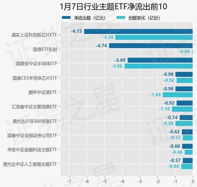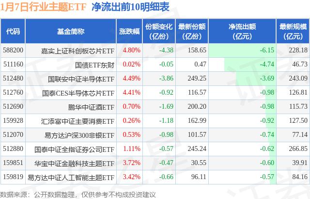 当天有 150 只行业主题 ETF 资金净流出,其中嘉实上证科技创新板芯片净流出排名第一。 ETF(588200),份额下降 4.38 一亿份,净流出额为 6.15 亿元。