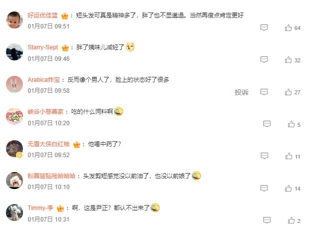 至于尹正的变化,网友们不仅没有取笑,反而表扬了更多的声音。有网友说:“短发真的精力充沛,胖了也不邋遢。当然,最好瘦一点。”甚至有人认为尹正长胖后,他之前的阿姨味道缓解了很多,整个人看起来更有内涵。