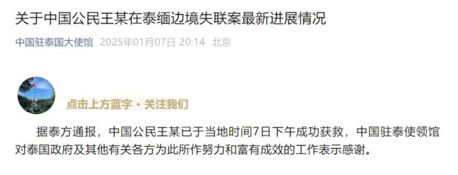 1月7日20时许,中国驻泰国大使馆发文称,据泰国通报,中国公民王某于当地时间7日下午成功获救,中国驻泰国大使馆领事馆感谢泰国政府等相关各方的努力和有效工作。