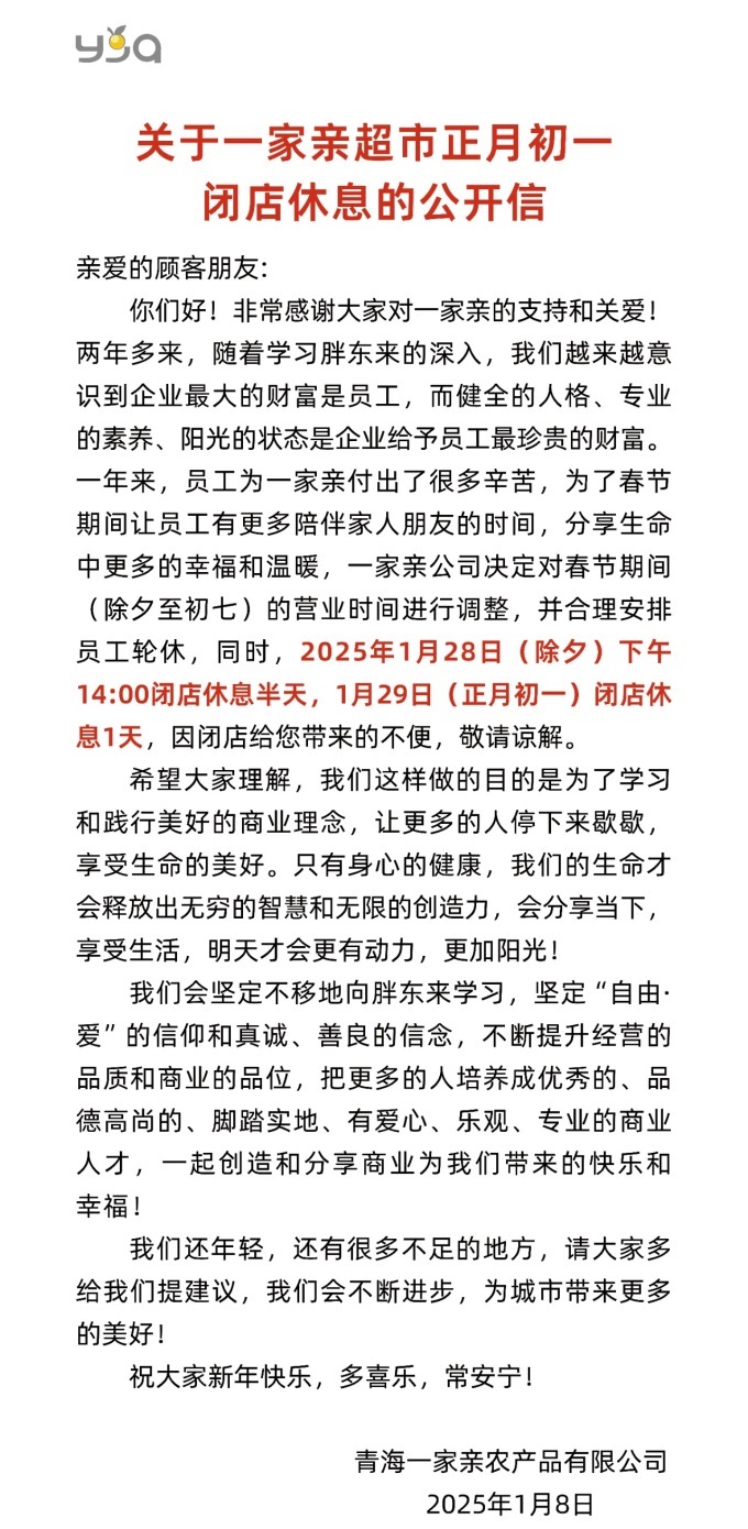 1月8日,青海某亲属超市发布关于2025年春节期间营业时间调整的公告。在公告中,一家亲属超市对客户长期以来的支持和关心表示深深的感谢,并详细说明了春节期间营业时间的具体安排。