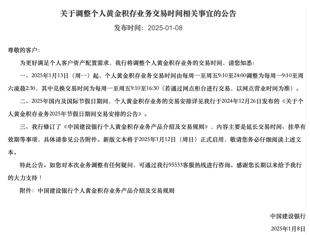 1月8日,建设银行发布《关于调整个人黄金囤积业务交易时间的通知》,称该行将调整个人黄金囤积业务的交易时间,以更好地满足个人用户的财务规划需求。