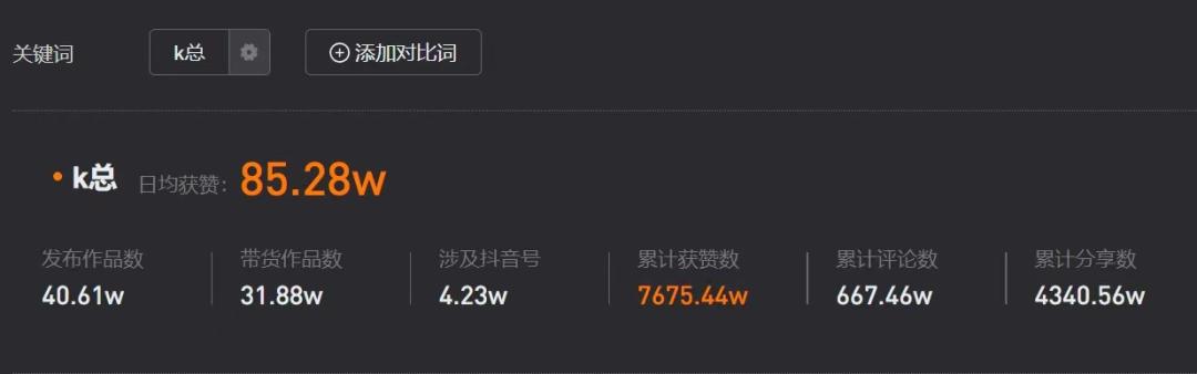 新抖数据平台显示,在过去的三个月里,与k相关标签的直播视频数量达到了40万个,涉及的抖音数量超过了4万个。正是这些牛毛般的直播切片视频,创造了k的整体辉煌,让k作为一个带货的博主,一个月就能通过切片迅速成为头部主播。