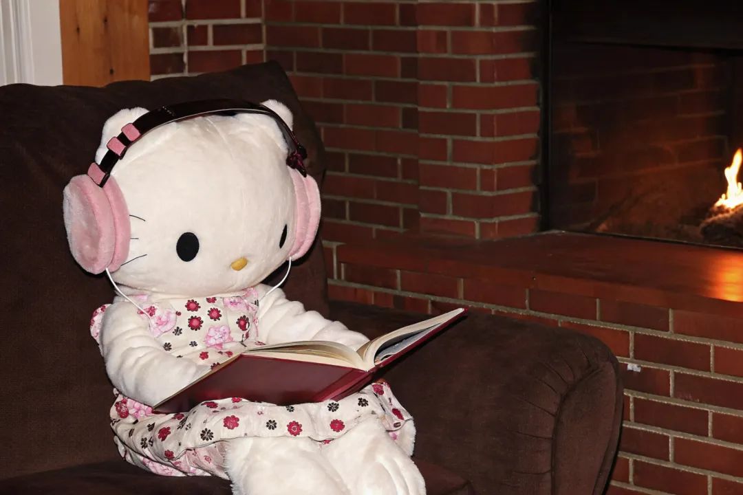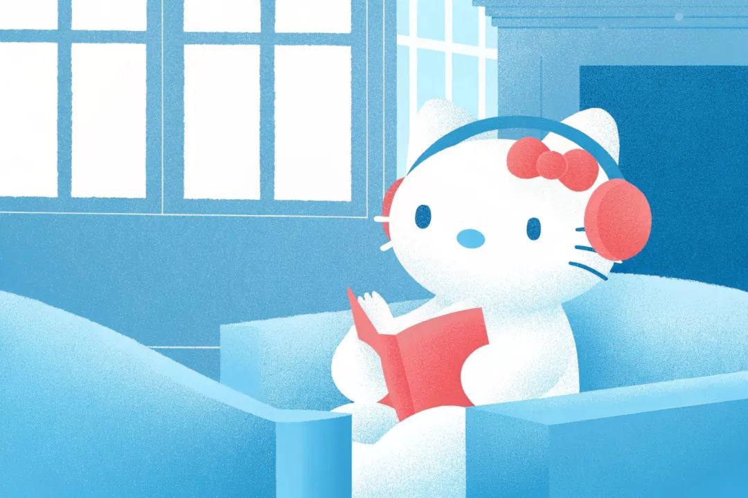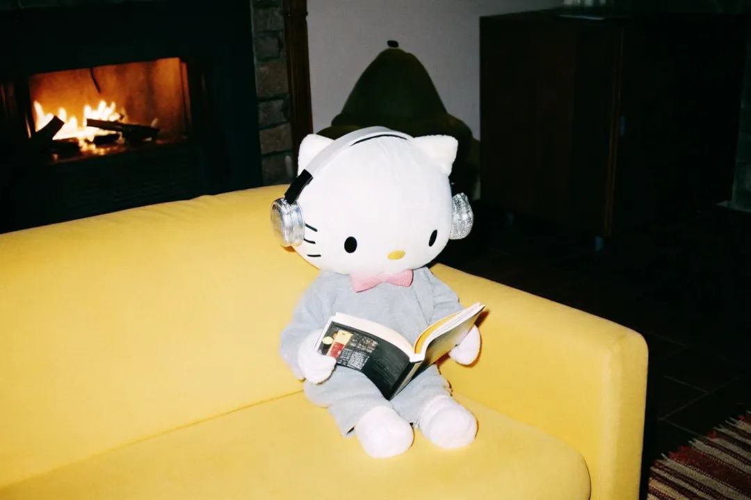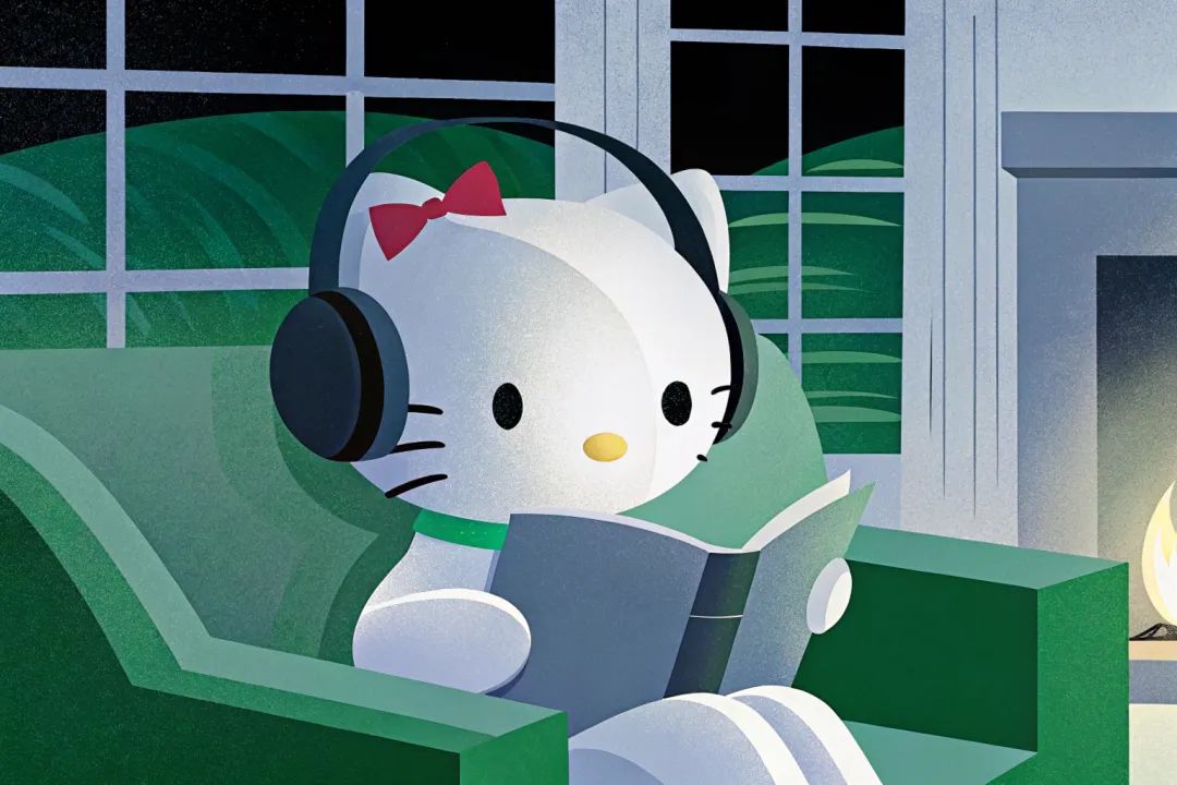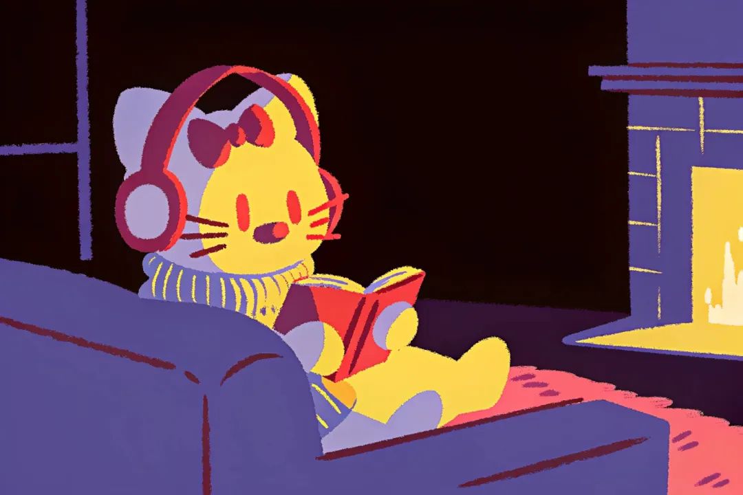 ● Recraft上有不同的风格预设,上面的图片是同一个提示词“Hello Kitty is wearing headphones and reading a book on the sofa. The background is a warm room with a fireplace”,各自使用Hard Flash、Retro Snapshot、Multicolor、Grain 2.0、Neon Calm风格。