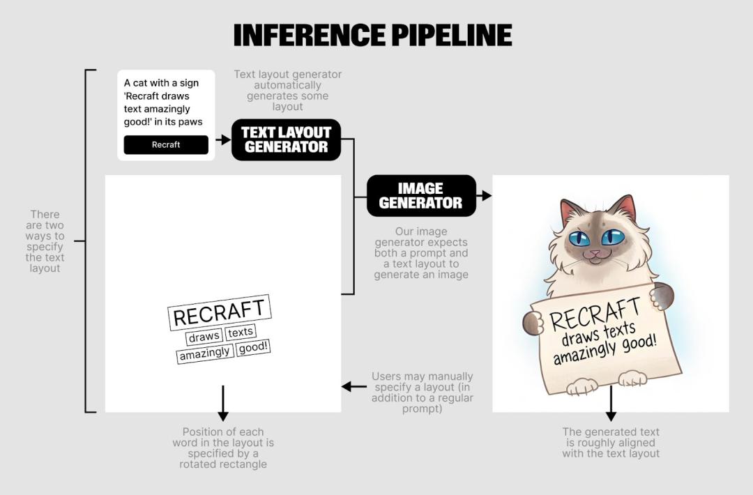 作者注:Recraft 团队在《How To Create SOTA Image Generation with Text: Recraft’s ML Team Insights》他们的训练原理已经得到了解释,包括文本生成器和图像生成器,它们通过绘制文本布局,为模型提供了更详细的输入条件,在图像中生成文本。