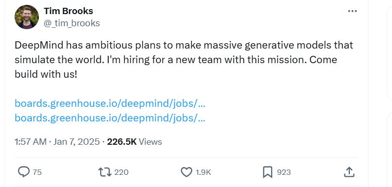 Brooks写道,“DeepMind有一个雄心勃勃的计划,需要制造一个大规模的生成模型来模拟世界。我正在招募一个新的团队来完成这项任务。”