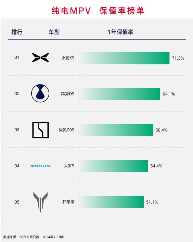 纯电动 MPV 现在完全是中国品牌的内斗,尽管只有 5 车在名单上,但是它们之间的保值率差距很大,这也说明这个市场的竞争还远没有白热化,各种车型的同质化也不严重。每辆车都有自己独特的产品卖点。而且从长期持有的车型来看,1 对家庭用户来说,年保值率的意义不大,不必过于关注这一数据。当然,如果你想买一辆二手准新车,拿着这份清单去买,那肯定是对的。