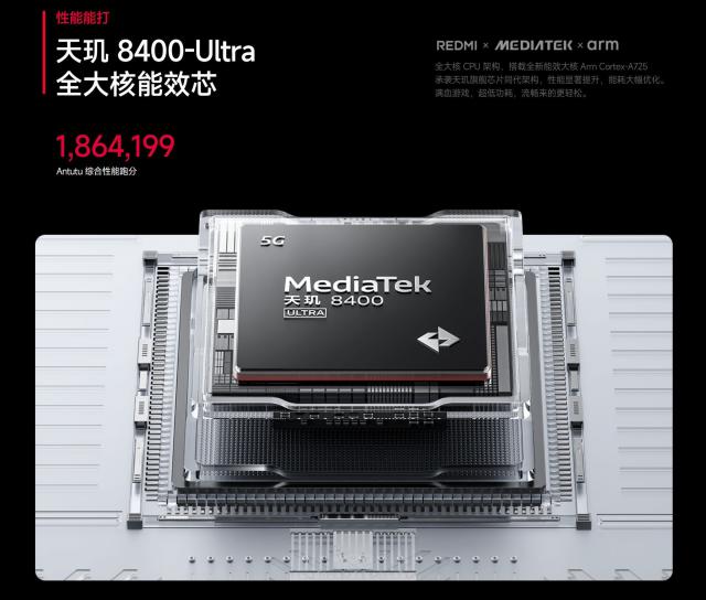 红米 Turbo4 配备MTK天玑 8400-Ultra Cpu,安兔兔跑分大概 181 万,性能可以满足日常使用和高画质游戏的需要,但是和高端旗舰Cpu相比还是有一定差距的。